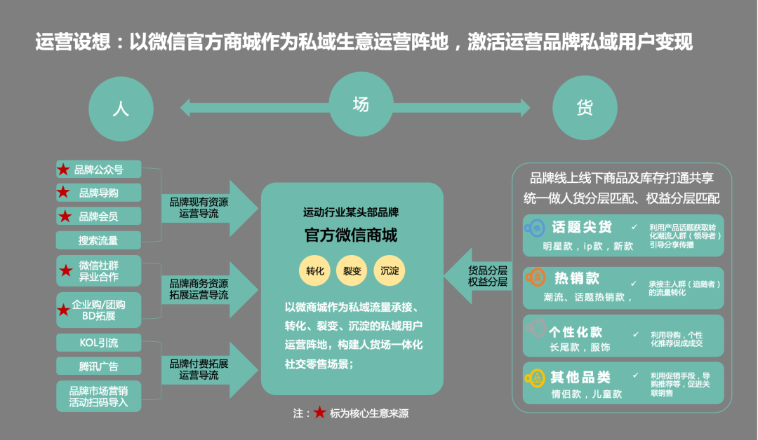 初期的运营设想,以微商城作为私域流量承接、转化、裂变、沉淀的私域用户运营阵地,构建人货场一体化社交零售场景,激活运营品牌私域用户变现;把公众号、导购、会员和企业团购作为核心生意来源。