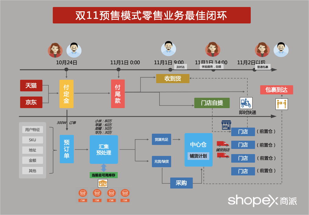 例如,当男性客户支付尾款后,由于对应的门店以及提前布置好库存,可以做到一半的客户在家里还没上班就收到心爱的手机,或者刚到公司就可以在前台取到熬夜支付尾款的战利品。这比以往双11由于快递爆仓,苦苦等待的体验好太多。