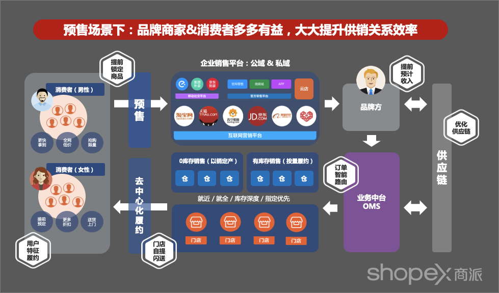 品牌提前根据预售情况,根据实际库存状况,(没有库存的该采购的采购,该生产的生产)提前根据消费者的情况,进行了供应链的优化。由于本身也需要为线下实体门店配置库存和补充库存。利用好末端的履约能力,根据商品的属性,不管是让消费者来门店自提,以便提升自己的品牌服务能力,促使进一步复购,还是让即使快递及时进行履约以让消费者享受及时达的体验,都可以做到收放自如。