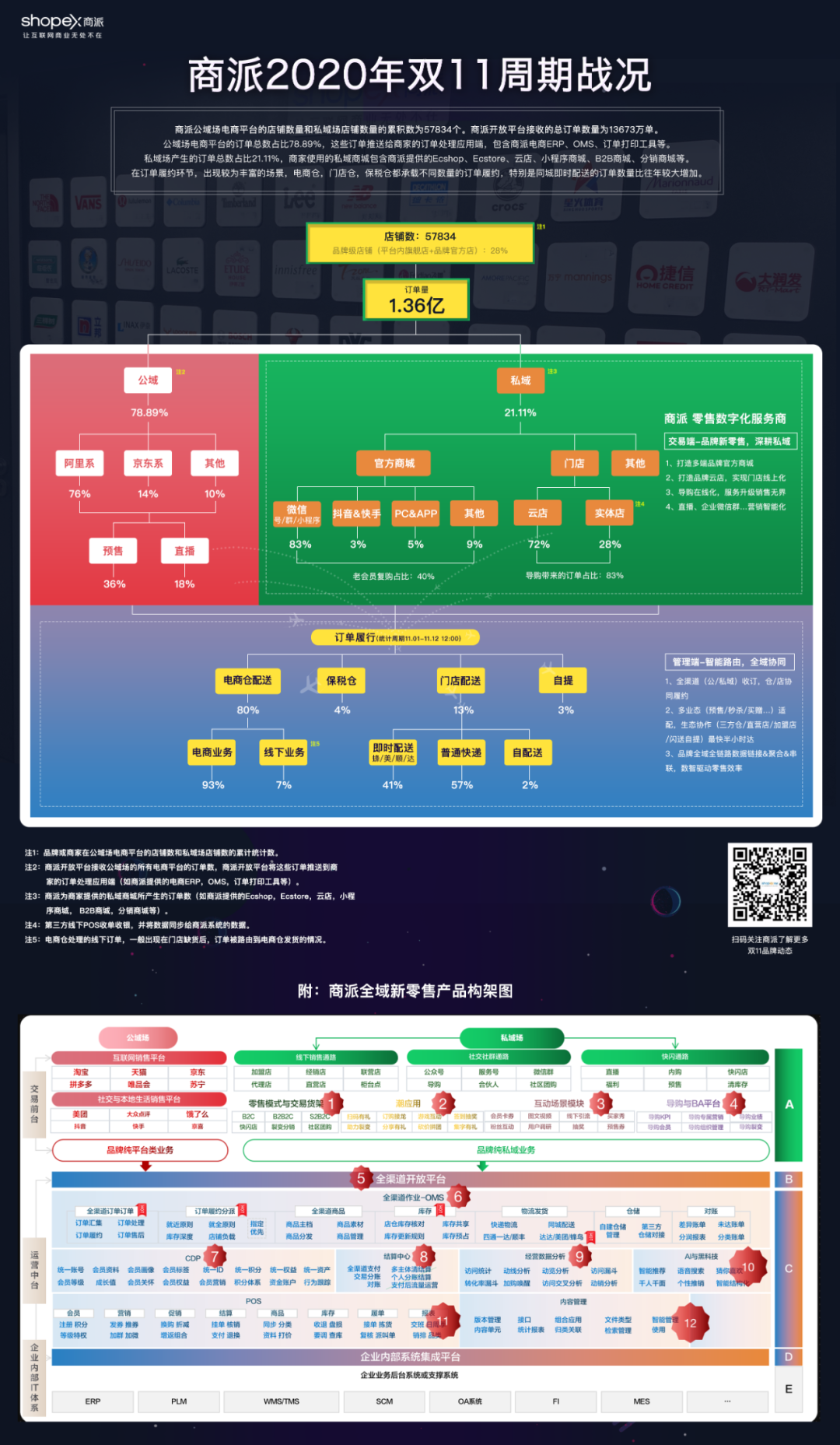 商派以品牌和平台的数字化服务商视角,结合开放平台数据,整理了下面这份更加完整的品牌在双11期间的业务结构图。虽然相关数据仅体现的是商派平台内品牌客户的战况,但也一定程度上可以看到品牌当下在公域和私域,在阿里系、京东系、微信生态和线下门店等不同渠道的业务结构数据。