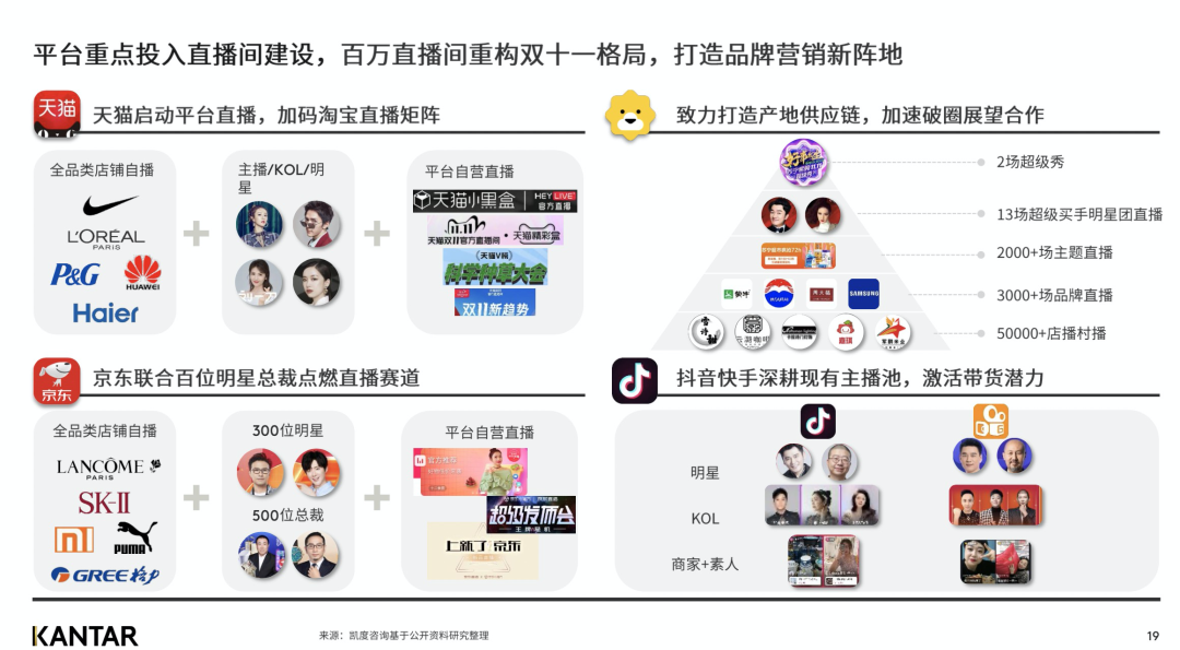 此外,直播电商成为今年“双11”最大亮点。各平台重点建设“百万直播间”,为品牌打造营销新阵地。一方面,头部职业主播带货效率成倍放大,成交金额与话题热度居高不下;另一方面,品牌高管、明星、虚拟IP主播等主播身份也更加多元化,并利用5G新技术、泛娱乐等更丰富的形式提升转化率、优化用户体验,提高品牌传播势能。(凯度)