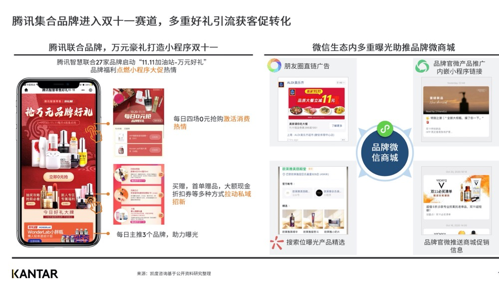 双11期间品牌商家通过小程序、企业微信、微信社群、智慧导购、视频号、小程序直播、微信小商店、搜一搜等内容与流量互动,实现了从线下到线上的流量转移,构建品牌商家自有的私域流量池,并通过各种活动开展用户经营和电商变现。