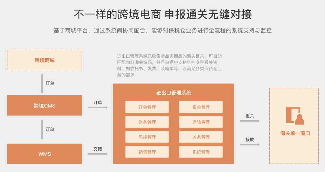 商派保税仓业务应用系统架构,通过自身完善的系统建设,多套系统间协同配合,能够对保税仓业务进行全流程的系统支持与监控。进出口管理系统从已与海关总署完成核注清单的接口对接与多个地方园区的申请入区接口对接,可实现全流程自动报关入区。
