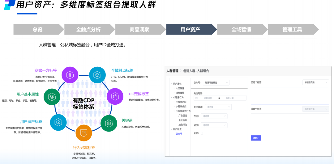 在私域运营中,用户资产管理极为重要。腾讯有数2.0第三大核心能力即为支持用户群体属性、行为、触点标签的组合提取,并对用户生命周期进行管理。