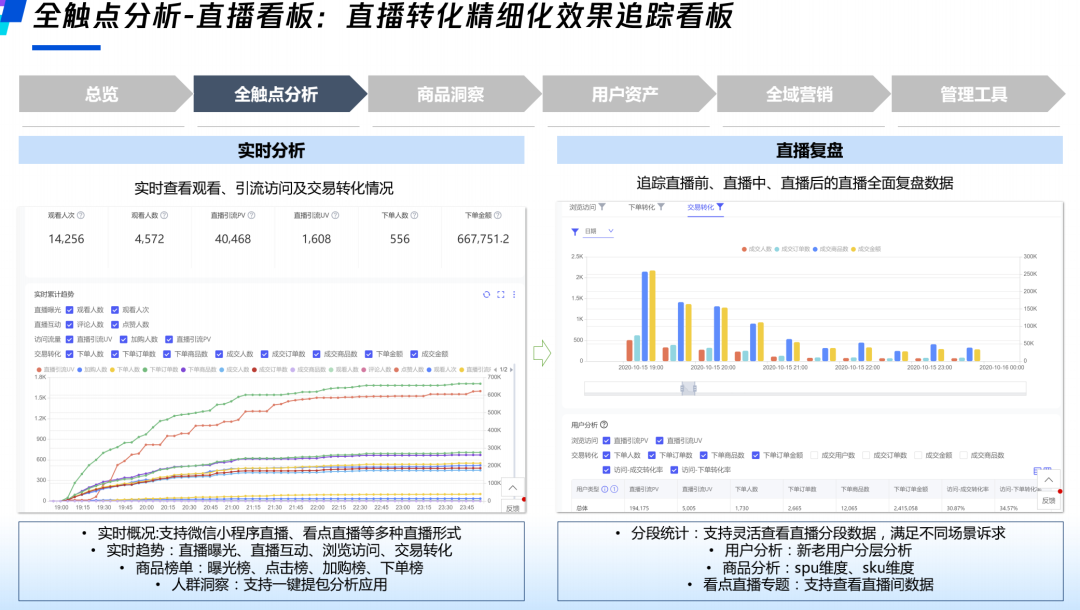 有“公众号分析”,可以覆盖公众号粉丝运营与图文带货,全路径评估转化效果;以及“直播分析”,可以支持直播间内运营数据及直播带货数据,包括实时分析和直播复盘。