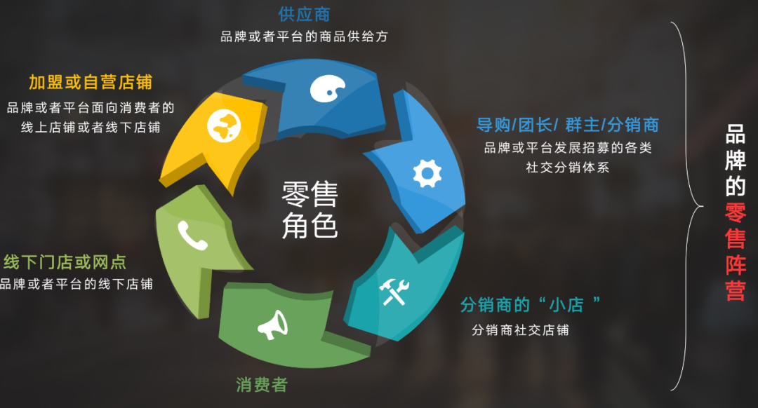 关于金融支付和多级利益分配的问题,已经成为众多企业想要开展全渠道零售业务急需解决的问题。如下图所示,品牌商的整个零售体系参与零售环节的角色非常多:供应商,加盟商,经销商,自营门店,分销商,甚至还有导购,团队,群主等等。这就需要有体系化的利益分配机制。