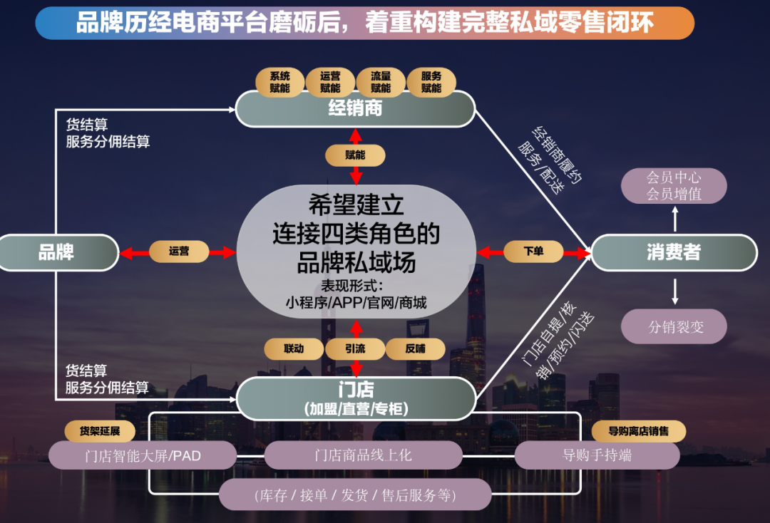 经销商直营化:总部统一搭建面向消费者的私域平台,总部来进行统一的定价,运营策略,促销策略和其他相关管理,经销商和经销商门店承担订单履约的角色,同时按照一定的规则进行与经销商的利益分配。这种方式适合强势品牌,总部具有较强的管控能力。甚至总部统一提供相关的经营类的IT系统,如统一的pos,统一的进销存等等。