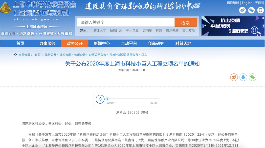 (俗称“科技小巨人”;公告网址:http://stcsm.sh.gov.cn/zwgk/tzgs/gsgg/bsgsgg/kjjhxmjggb/20201203/fc6feb49d58c457d9e269fd972f9a610.html;序号:71)