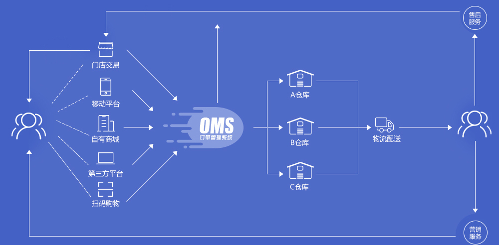 利用OMS社会化已整合服务资源;将店铺管理,客户服务,订单处理,售后服务;电商仓储管理,配,拣,发,